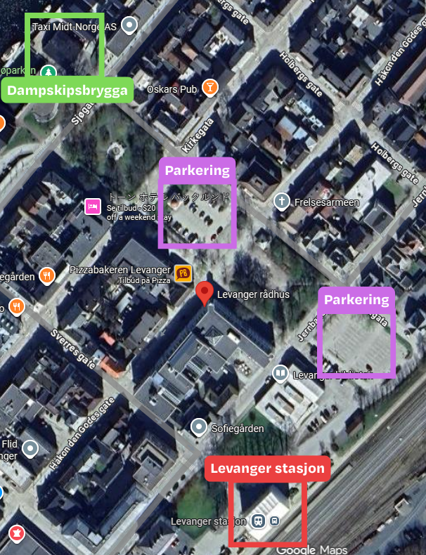 Nærmeste parkeringsplasser er ved Levanger Rådhus ved Håkon den Godes gate 30.