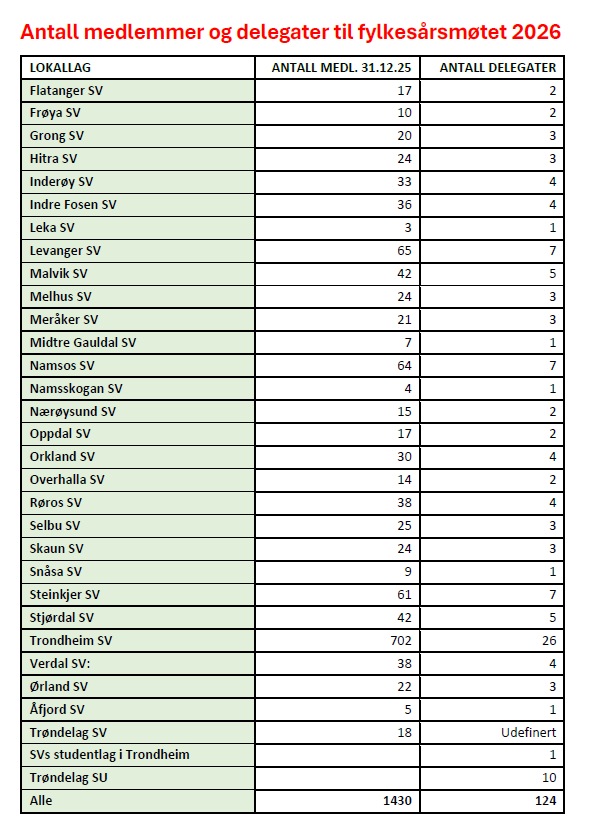 Oversikt over antall medlemmer og delegater i Trøndelag SV i 2026