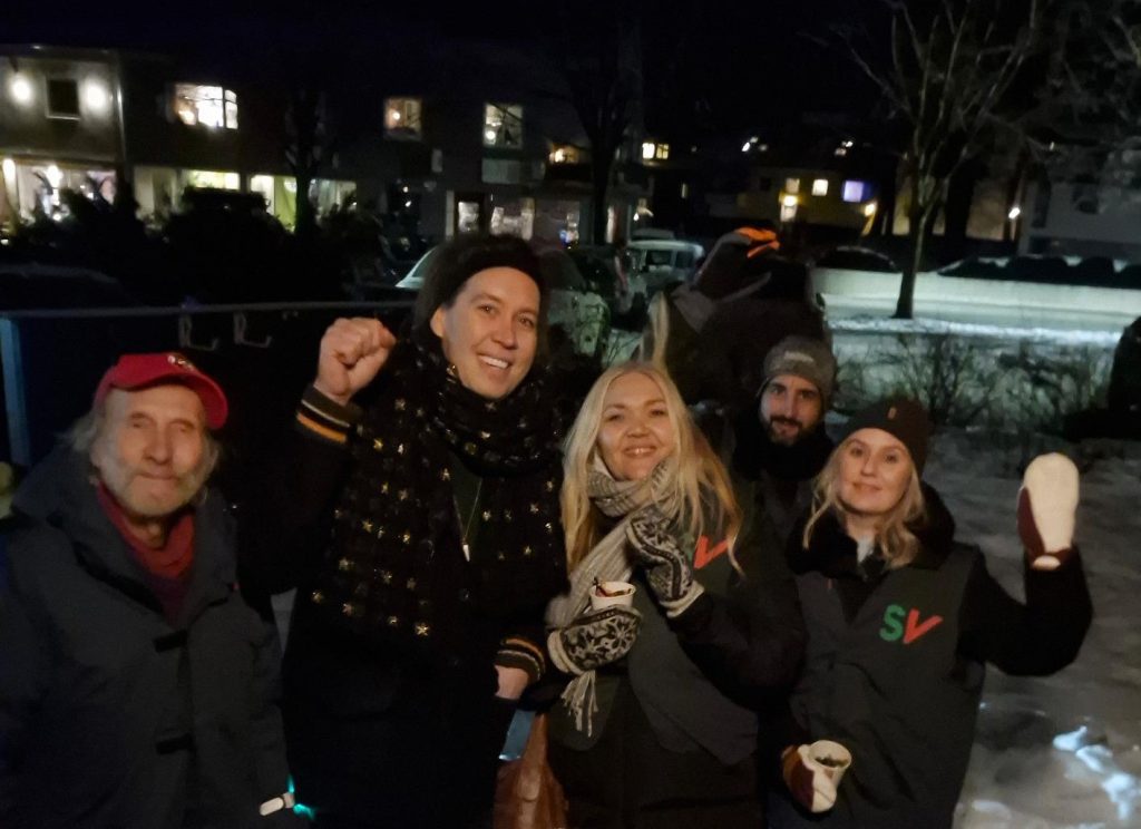 – Silje, lokallagsleder i Steinkjer SV, prøvde dørbanking for første gang 28. januar 2026. Her sammen med flere medlemmer i Steinkjer SV under dørbankskolering i Steinkjer.